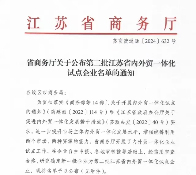 此次試點企業的評選,是江蘇省積極響應國家商務部等14部門聯合發布的《關于開展內外貿一體化試點的通知》(商建函〔2022〕114號),并結合《江蘇省政府辦公廳關于促進內外貿一體化發展若干措施》(蘇政辦發〔2022〕40號)文件精神,旨在通過構建高效聯通的內外貿體制機制,打通內外貿堵點,促進國內國際雙循環相互促進的新發展格局。